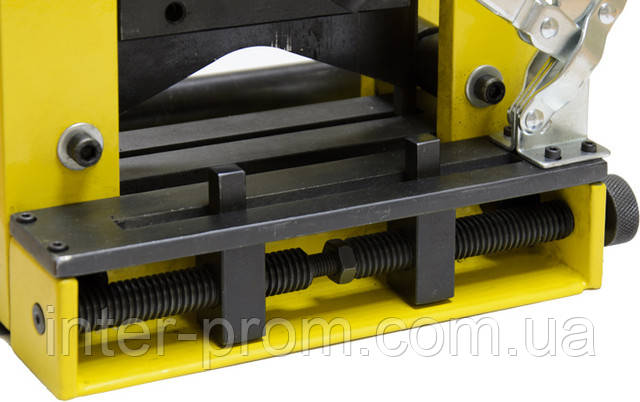 Однією з сторін модернізації шинореза ШР-150+ SHTOK. стало впровадження системи напівавтоматичного виставлення співвісності гідравлічного циліндра і шини – оператор встановлює шину в автономному агрегаті і, обертаючи направляючий гвинт, ваймами виставляє мідну шину строго по центру ножа.